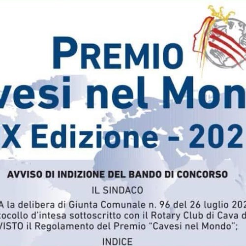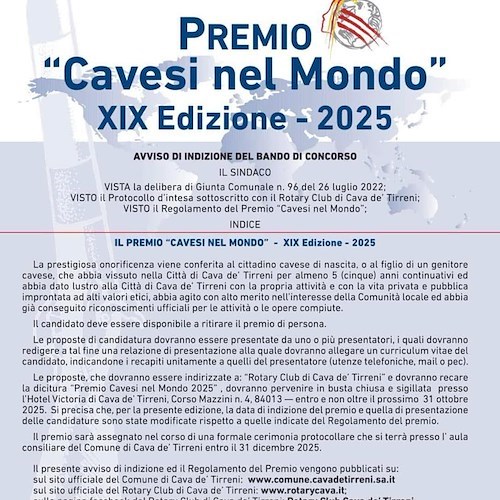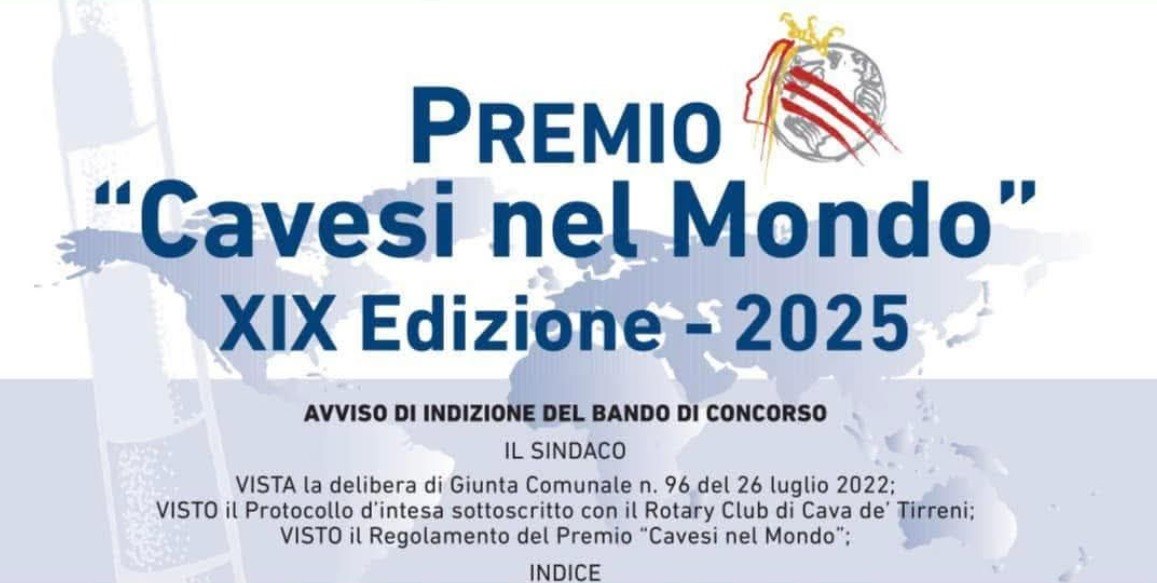 È ufficialmente avviata la procedura per il Premio "Cavesi nel Mondo" - XIX Edizione 2025, prestigiosa onorificenza istituita dal Comune di Cava de' Tirreni in collaborazione con il Rotary Club Cava de' Tirreni.