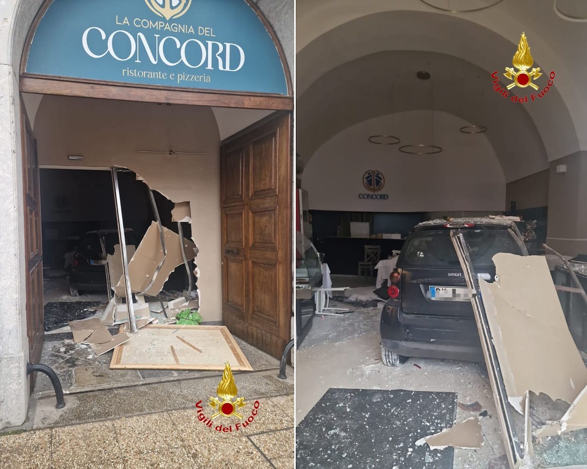 Attimi di terrore ieri pomeriggio a Fuorni (Salerno). Per ragioni da verificare legate probabilmente a questioni personali, un uomo è balzato con l'auto, una Smart, all'interno del ristorante Compagnia del Concord, sfondando la parete e terminando la corsa al centro della sala.