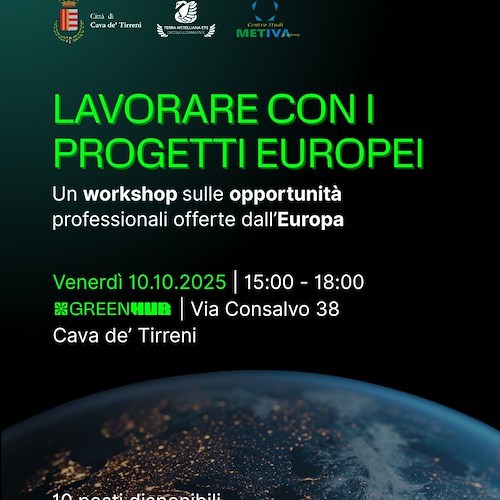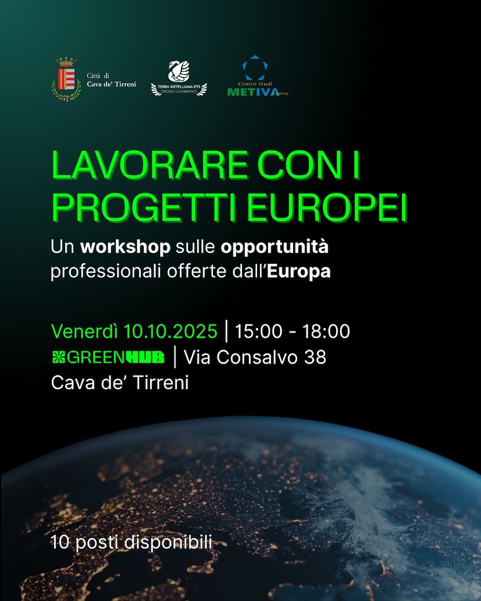 Il Green Hub, l'incubatore d'impresa del Comune di Cava de' Tirreni, gestito da Terra Metelliana APS - Circolo Legambiente, insieme a Metiva Academy, ha organizzato un workshop sulle opportunità professionali offerte dall’Europa.