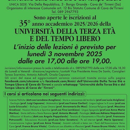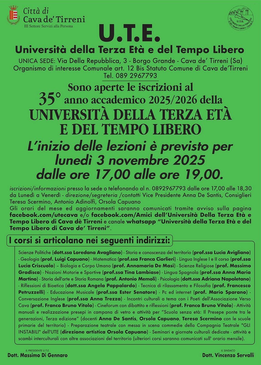 Sono ufficialmente aperte le iscrizioni al 35º anno accademico 2025/2026 dell'Università della Terza Età e del Tempo Libero (U.T.E.) di Cava de' Tirreni, organismo di interesse comunale con sede unica in via della Repubblica 3, Borgo Grande.